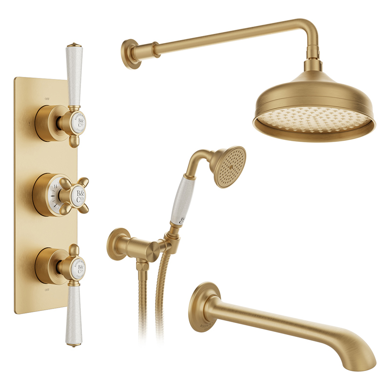 Zestaw wannowo-prysznicowy z deszczownicą, słuchawką i wylewką - Mosiądz szczotkowany - Booth&Co. - Axbridge - BC-AXB-BSS-BRS