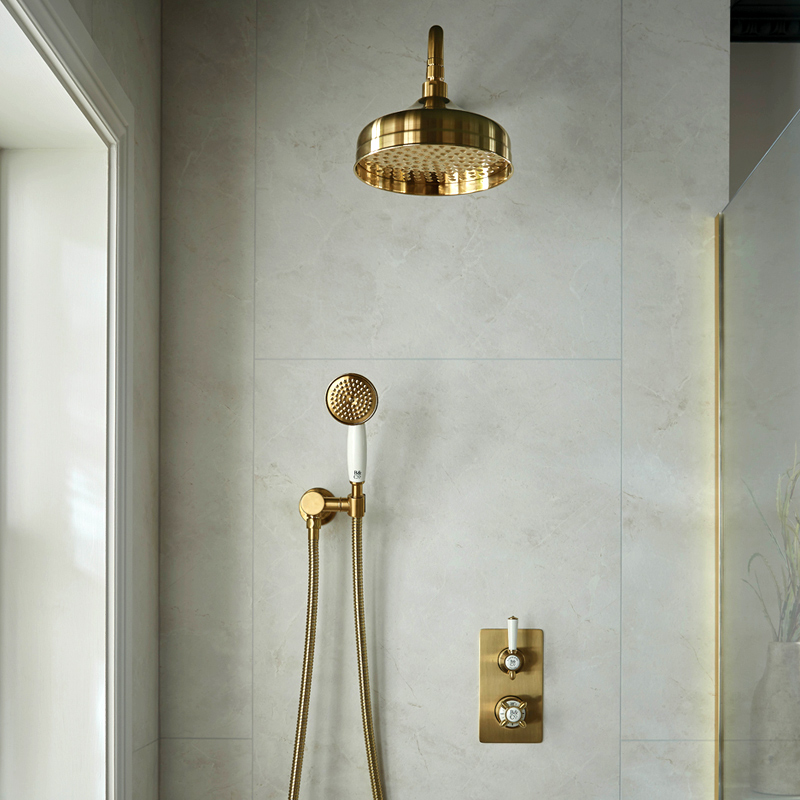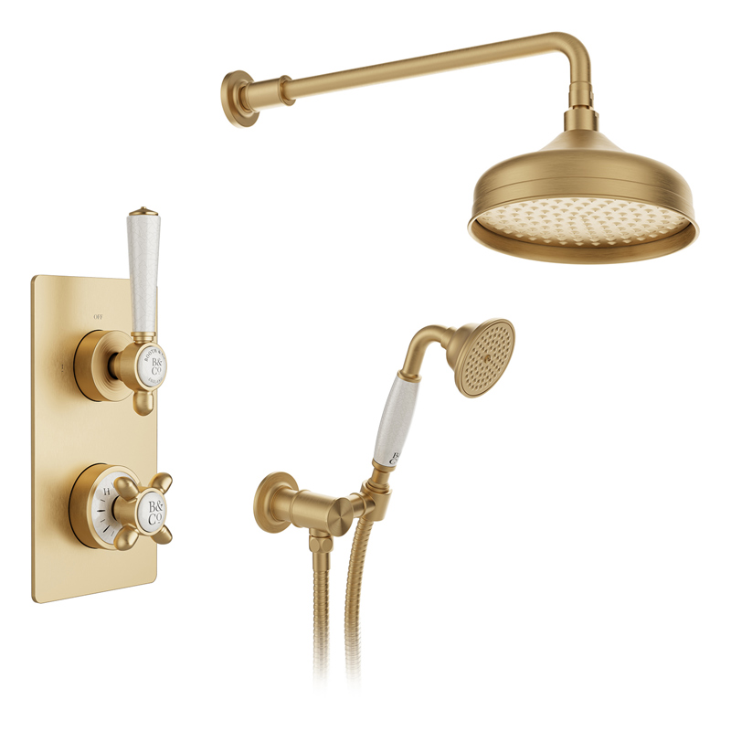 Zestaw prysznicowy z deszczownicą i punktową słuchawką prysznicową - Mosiądz szczotkowany - Booth&Co. - Axbridge - BC-AXB-SS1-BRS