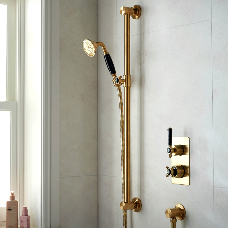 Zestaw prysznicowy z deszczownicą i słuchawką prysznicową na drążku - Mosiądz szczotkowany - Booth&Co. - Axbridge - BC-AXB-SS2-B-BRS